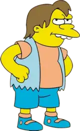 Nelson is a 12-year-old student and bully at Springfield Elementary School. He is known to have terrorized virtually every child in Springfield at one point or another. Most often, it is the school nerds and less popular students, such as Milhouse and Martin, who are the subjects of his cruelty. Nelson shows the occasional glimpse of humanity, and other characters have warmed to him because of that; Lisa dates him briefly in "Lisa's Date with Density", Marge informally adopts him in "Sleeping with the Enemy", and Bart is shown as a friend to him several times, such as in "The Haw-Hawed Couple".