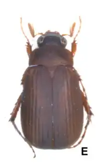Adults reach a length of about 8.8โ9.1 mm. Their body is oblong and reddish brown, with the ventral surface and antenna yellow, and the dorsal surface dull and almost glabrous.