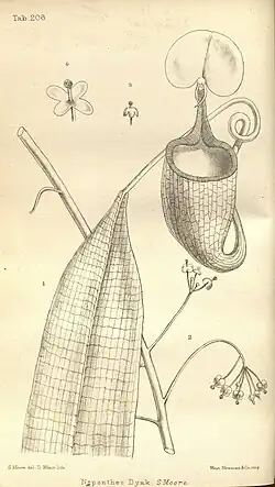 Right: Upper pitcher and part of male inflorescence of N. dyak, from Moore's 1880 description[3]