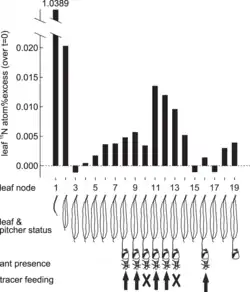 Centre: Nitrogen flux from C. schmitzi colonies to an N. bicalcarata host plant (c. 1.4 m diameter). The bars show the change in 15N concentration in the host plant's leaves two weeks after a pulse of 15N was fed to the associated C. schmitzi colonies. Leaf node 1 has the youngest (still developing) leaf, with the others numbered sequentially as one moves down the stem. The pictograms below the graph show the state of each leaf and pitcher, and indicate the presence or absence of C. schmitzi and whether a 15N pulse was administered.[44]