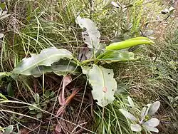 Nepenthes rajah is a scrambling vine. The stem usually grows along the ground, but climbs whenever it comes into contact with a suitable support. The stem is up to 30 mm (1.2 in)) thick and may reach up to 6 m (20 ft) in length, although it rarely exceeds 3 m (9.8 ft).[3]: 10, 120 The leaves are distinctive and reach a large size. They are leathery in texture with a wavy outer margin. The leaves are characteristically peltate, whereby the tendril joins the lamina on the underside, before the apex. The tendrils are inserted within 5 cm (2.0 in) below the leaf apex and reach a length of approximately 50 cm (20 in).[3]: 120, 122