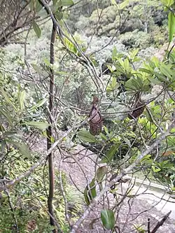 If the type locality is the site of the last remaining population of this species then it is one of rarest Nepenthes known and "threatened with imminent extinction".[4] In Pitcher Plants of the Old World, Stewart McPherson wrote that field studies are "urgently required" to properly assess its conservation status.[4] In 2010, the Rare Nepenthes Collection was established with the aim of conserving N. rigidifolia and three other critically endangered Nepenthes species: N. aristolochioides, N. clipeata, and N. khasiana.[11][12][13]