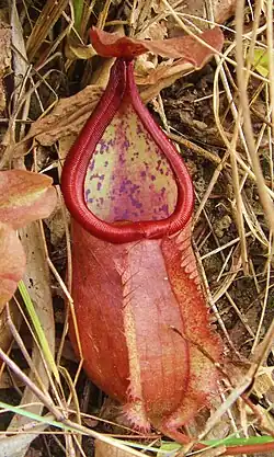 Rosette and lower pitchers are either wholly ovate or ovate in the basal half of the pitcher cup and narrower above. They measure up to 15 cm in height by 5 cm in width. The hip is usually located near the middle of the pitcher, but may be completely absent in entirely ovate traps. A pair of wings (≤12 mm wide) runs down the ventral surface of the pitcher cup, bearing narrow fringe elements. The pitcher mouth is smoothly triangular and has an oblique insertion. The peristome is flattened and up to 10 mm wide, with teeth up to 1 mm long. The extent of the glandular zone of the inner surface is variable, ranging from one-third to two-thirds of the pitcher's height. The pitcher lid or operculum is broadly to narrowly ovate. It has a slightly cordate base and is often irregularly wavy at the margins. It measures up to 4.5 cm in length by 3.5 cm in width, being as large as or smaller than the pitcher orifice. The lower surface of the lid does not have any appendages, but bears numerous crater-like glands (≤1 mm in diameter), the largest of which are located around the midline. A small depression is also present on the lower surface of the lid, near the apex. An unbranched spur (≤5 mm long) is inserted near the base of the lid. On their outer surface, terrestrial pitchers are typically green to orange with red stripes, or red throughout. Red blotches are present in the waxy zone of the inner surface. The colour of the peristome is highly variable and may be green to orange or red. The lid ranges in colour from orange to red, and bears fine red streaks.[2][4]