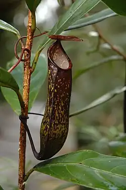 The natural hybrid N. muluensis × N. tentaculata was described as N. × sarawakiensis in 1993 by J. H. Adam, C. C. Wilcock, and M. D. Swaine.[29] The authors distinguished the taxon from N. muluensis on the basis of its branched spur and the presence of fringe hairs on the top of the lid. They also compared the distribution of phenolic compounds in the leaves of N. muluensis and the hybrid, although they did so without specifying the number of plants studied or the number of repetitions performed.[16] As a result, doubts have been raised over the existence of this hybrid. Charles Clarke writes that the authors described N. × sarawakiensis "in such a way that their work cannot be easily repeated".[16] Although this natural hybrid is likely to exist, it is possible that N. × sarawakiensis was described based on specimens of N. muluensis with lower pitchers.[16]