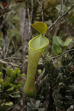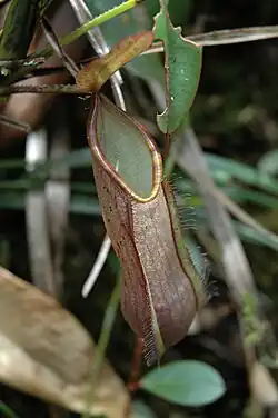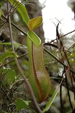 The pitchers of N. tentaculata are generally quite small, rarely exceeding 15 cm in height.[3] However, in exceptional specimens they may be up to 30 cm high by 8 cm wide. Rosette and lower pitchers are ovoid in the basal third and cylindrical above. Upper pitchers are more cylindrical throughout. A pair of fringed wings runs down the front of lower pitchers, while in upper pitchers these are often reduced to ribs. The pitcher mouth is usually ovate, becoming acute at the front and rear. Its insertion very oblique. The peristome is roughly cylindrical in cross section and up to 5 mm wide. It bears small ribs and its inner margin is lined with tiny teeth.[16] The inner portion of the peristome accounts for around 57% of its total cross-sectional surface length.[17] The pitcher lid or operculum is ovate and typically obtuse. Often, numerous filiform appendages are present on the upper surface of the lid, concentrated near the edge.[16] However, some forms of the species lack these structures altogether.[3]