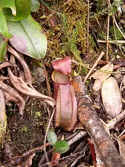 The species typically inhabits mossy forest, although it has also been recorded from ridge-top vegetation on mountain summits. Unlike many other Nepenthes species, N. tentaculata does not occur as an epiphyte; it always grows terrestrially.[19] Plants often grow in clumps of Sphagnum moss, spreading vegetatively via creeping subterranean stems.[20]