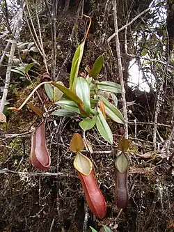 Nepenthes tentaculata is also similar to N. murudensis, which is often described as resembling a giant form of the species.[3][16] Nepenthes murudensis differs in lacking filiform hairs on the upper surface of the lid, being more robust in all respects, and having a dense indumentum on inflorescences and some vegetative parts.[16][24][25] However, a number of populations of N. tentaculata from northern Sarawak produce pitchers exceeding 20 cm in height and these may be very similar in appearance to N. murudensis.[16] Nepenthes murudensis also differs in that its aerial pitchers lack wings. Although N. tentaculata is variable in this respect, plants from Mount Murud usually produce upper pitchers with wings.[20]