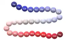 ![]() Neuropeptide W primary sequence using three letters code. N-terminal represented in blue. C-terminal represented in red. | |||||||