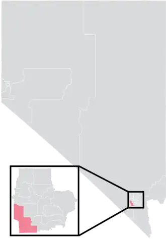 The district is located entirely within Nevada's 3rd congressional district, and overlaps with the 9th and 35th districts of the Nevada Assembly.[4] It has a total surface area of 63 square miles (160 km2), and a perimeter of 43.7 miles (70.3 km).[5]