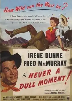 Never a Dull Moment is a 1950 American comedy western film from RKO Pictures, starring Irene Dunne and Fred MacMurray.[4] The film is based on the 1943 book Who Could Ask For Anything More? by Kay Swift. The filming took place between December 5, 1949, and February 1, 1950, in Thousand Oaks, California.[5][1] It has no relation to the 1968 Disney film of the same name starring Dick Van Dyke and Edward G. Robinson.