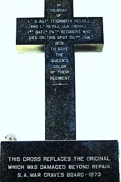 On 22 January 1879, after the disaster of the Battle of Isandlwana, South Africa, Lieutenant Coghill joined Lieutenant Teignmouth Melvill[3] who was trying to save the Queen's Colour of the Regiment. They were pursued by Zulu warriors, and while crossing the swollen River Buffalo, Lieutenant Coghill (despite his injured knee) went to the rescue of his brother officer, who had lost his horse and was in great danger. Although Coghill's horse was shot by a Zulu warrior, the valiant soldier swam on to rescue Melvill. After some time, the Colour was swept from their grasp and floated down the bank. After reaching the bank, the two men were eventually overtaken by the Zulu warriors and, following a short struggle, both were killed.[4][5] Lieutenant Walter Higginson, who was persuaded to escape, heard and witnessed their final actions when they fought to the last. The Colour was retrieved from the river ten days later by a mounted party under Major Wilsone Black.[6]