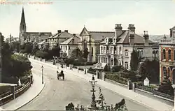 New Barnet Congregational Church (far left with spire) on a c. 1900 postcard of Station Road, New Barnet.
