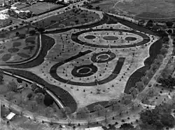 In 1935 the main drive was sealed with bitumen to reduce the dust problem, but a shelter for a visitor's book that was proposed the same year did not eventuate. In 1938 it was decided to create a proper cricket oval, with land filling to the level of Sydney Street, although this would only contain one football field. Two dressing sheds were built near the oval in 1938, and basketball courts were constructed 1938–1939, around the tennis courts that existed in the northern corner of the park- currently the library's carpark. In 1940 it was proposed to remove the bougainvillea hedge (visible in a 1937 aerial photo) from around the rose gardens, and to plant more jacarandas around the drive. There were supposedly 20,000 rose bushes in the park by 1940, according to the Queensland Government Tourist Bureau. The old rose bed design of Moore's can be clearly seen in a 1937 aerial photograph, but by 1946 this design was a ghost of its former self.[1]