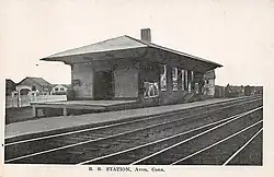 Starting in New Haven, the railroad reached Plainville, 27 miles (43 km) away, by the end of 1847.[5] A temporary station was built between Hillhouse Avenue and Temple Street in downtown New Haven along with engine facilities, though the canal continued further south.[6] As built, the railroad closely followed (or in places was even built on top of) the existing Cheshire Turnpike between New Haven and Hamden, leading to a high frequency of accidents between trains and horse-drawn carriages.[3] In 1850, it was joined by the Hartford, Providence & Fishkill Railroad's line between Hartford and Waterbury.[7] The first trains ran in January 1848, though construction continued northwards to Granby, Connecticut.[5]