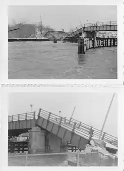 The old Lovelandtown bridge was swung open and process began on demolishing the old structure in January 1973.[86] As demolition continued on the bridge, the United States Coast Guard put out buoys noting the locations of the old pilings for the bridge, located 45 feet (14 m) apart from each other just under the surface.[87] The work continued into May on removing the piles from the site of the piers, which had been blasted apart in the demolition process.[88]