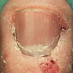 Jeffrey M. Barr of The Lantern wrote on June 18, 2001 that "the CD is easy to find at the local record shop because of its gross and disturbing cover of an infected toenail. Then there is the music that comes off as loud and intense. And then the band becomes instantly recognizable." Barr said that the track "Goodbye" sounded "[almost] identical to the band Filter's style of music", adding that "it's an enjoyable song and one of the band's best tracks."[20] He concluded his review by stating that "Skrape is not the most original band to come around, but they do have a sound that many people will like."[20] In his March 2001 review, Adam Pugh of the Arizona Daily Wildcat gave it a C rating, writing "Skrape tries to pretend that it has made something new. In reality, it has ripped off the vocals of Chino Moreno from the Deftones and shamelessly stolen Korn's guitarists." He added, "the music, despite its 'borrowed' status, is very well done, incorporating punchy rhythms and exhilarating screams. The vocals are clean, something which makes the band sound great, but each song sounds like a band we've all heard before."[21] Dan McQuade of 34th Street also critiqued their lack of originality in his July 2001 review. McQuade added "Skrape has very few things going for them. One thing they are excellent at is album packaging. Their album has to be one of the cleverest uses of packaging ever. While their album packaging is well done, it is sad that the packaging is the best part of New Killer America."[22]