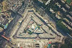 New Market Copy area is triangular in shape with high arched entry gates on three sides. There were spaces for 440 shops and a triangular lawn at the center. The total area was 35 acres (140,000 m2) of land.[1]