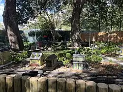 The westernmost most portion of the garden, just outside the doors of the Conservatory, sits an exciting and diverse area. Visitors are first greeted by cold frames, raised gardens edged in bricks originally meant to grow bedding plants for transplant. These structures are original WPA structures and provide a glimpse into the past. Farther west lie the vegetable and herb gardens as well as a demonstration garden that showcases seasonal vegetables, fruits, and other edible crops. An aromatic herb garden sits just northeast of the vegetable garden, this section is devoted to fragrant herbs and flowers that are known for their pungent smells, providing a diverse olfactory display as visitors also meander through the medicinal herbs section to the plot dedicated to culinary growing. A friendship garden, maintained by volunteers, provides a home for a variety of seasonal plants, and two small greenhouses here house a cactus and succulent plant collection. Finally, the Train Garden features miniature buildings made of botanical materials in a layout of the City of New Orleans. Visitors walk a pathway that follows the course of the Mississippi River and other bodies of water surrounding the city. 1,300 feet (400 m) of track carry miniature streetcars and trains that actually run on weekends and for special events. Stops along the way provide history of various buildings and neighborhoods.