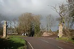 The site of New Shute House is sloping from the front to the back of the house, which allows for an uninterrupted view of the distant sea. The Poles may have been influenced by the landscaping at Mount Edgecumbe House near Plymouth,[36] Saltram and Killerton House.[37] Pole employed John Veitch, Sir Thomas Acland's head gardener at Killerton, as his landscape designer, who contracted in 1790 to complete the works, which included the making of new roads and fences, by 29 September 1794.[38] Pole planted a large number of young trees, including 1,000 larch and 950 Spruce, as an invoice from the firm Gould Smith dated November 1797 records.[39] Veitch also made the new road to Shute village beyond the Elizabethan Shute Gatehouse ("the Old Lodge") and onward to the road leading to "Shute Piers", about one mile away.[40] The contract specifies: "Toward the lodge...let the road be sunk three feet deeper than the ground is at present as it passes between the Old House and the Church to give more room under the Lodge and also to produce ground for forming the plantation each side intended to cover the said Old House, stables and the churchyard; also to form a plantation ground by raising it up for planting against the walls on each side of the lodge so as when planted and grown-up the said lodge may only appear between the said plantations".[41] Bridie had noted in her work that the lower windows of the gatehouse were now below ground level, but had not ascertained the reason.