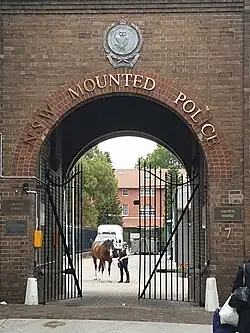 For over a century the New South Wales Mounted Police were a key part of policing, as horses were the main form of transport. The unit was formed three years before the London Mounted Police[14] and 38 years prior to the 1873 formation of the Royal Canadian Mounted Police.[15] By the 1900s the Mounted Police had grown to a strength of over 800 personnel and more than 900 horses. Most stations throughout the state had mounted units attached to them. It was around this time that they unit was moved from Belmore Barracks, to allow for the construction of the present Central railway station, to a temporary base at Moore Park, and then on to the Bourke Street Police complex at Redfern in 1907.