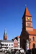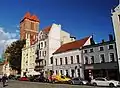 Since the beginning of the 14th century the centre of the square has been occupied by the New Town Hall, which housed the meeting room of the Town Council, the hall of the juror's court, the rooms of the chancellery and the chamberlain's, cloth halls, bread benches, and in the cellars (only rooms of the Gothic Town Hall preserved to this day) a beer cellar and a prison. After the merger of the Old Town with the New Town in 1454, the building became an auxiliary seat of the town authorities, and in time it was converted into a warehouse. Since 1668, after the evangelical community of the New Town lost the church of St. James and the necessary adaptation (including removal of the ceiling between the ground floor and the first floor), it was assigned as a Lutheran church of the Holy Trinity. Transformed into a church, the Gothic Town Hall managed to survive until the beginning of the nineteenth century. Due to its poor condition, it was decided to build a new building of the church of the Holy Trinity. The design of the church originally included the use of the existing perimeter walls together with the rear elevation; the front elevation was meant to be completely demolished. The Neo-Romanesque style building, designed by Karl Friedrich Schinkel, was finally completed in 1824. It served the Evangelicals until 1918, then from 1927 to 1939 served as an Orthodox church of the Toruń parish. Currently, it is the seat of the Tumult Foundation.[1][2]