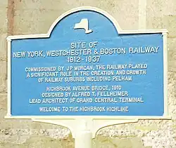 The New York, Westchester and Boston Railway Company (NYW&B, also known to its riders as "the Westchester" and colloquially as the "Boston-Westchester"), was an electric commuter railroad in the Bronx and Westchester County, New York from 1912 to 1937. It ran from the southernmost part of the South Bronx, near the Harlem River, to Mount Vernon with branches north to White Plains and east to Port Chester. From 1906, construction and operation was under the control of the New York, New Haven & Hartford Railroad (NH) until its bankruptcy in 1935.