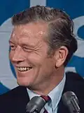 On February 10, 1969, New York City received 15 inches (38 cm) of snow and in one day alone, 14 people died and 68 were injured.[6] For three days, the city was completely paralyzed; streets, subways, airports, and schools were suspended. Lindsay faced repeated criticism during and after the blizzard that he had prioritized his native borough of Manhattan over the four other boroughs, particularly Queens, which remained unplowed over one week after the storm.[7] The criticism prompted Lindsay to visit Queens but, after his limousine became trapped in Rego Park, he was forced to abandon it in favor of a four-wheel truck and was heckled by local residents.[8]