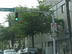 The Palmer Avenue name ends at a junction with Secor Road, at which point NY 125 becomes known by the latter name. One block to the north, the highway connects to the east end of the Heathcote Bypass. From here, NY 125 takes a northeasterly track out of Secor Gardens and Scarsdale, passing the Fenway Golf Club on its way into the city of White Plains.[3] Across the city line, maintenance of the route shifts to the county once again as CR 26.[4] Now known as Old Mamaroneck Road, NY 125 serves several of the city's residential neighborhoods as it approaches downtown White Plains. The highway crosses into Gedney Park, becoming a two-lane residential street as it approaches Mamaroneck Avenue.[3] At this junction, NY 125 shifts from a county-maintained road to a city street[6] as it turns northwest through downtown White Plains. The route continues for another three blocks to its north end at junction with NY 22 (East Post Road), several blocks south of NY 119 (Main Street).[3]