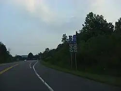 NY 169 begins a short distance north of New York State Thruway (I-90) exit 29A at an intersection with NY 5S in the town of Danube. It initially heads northward, paralleling a north–south roadway leading away from the exit that overpasses NY 5S. The two roads converge after 0.37 miles (0.60 km), directly connecting NY 169 to the Thruway.[1] NY 169 continues on a northward course to just south of the Mohawk River, where it turns to the northwest and subsequently follows the river, through a wooded area that leads toward the city of Little Falls.[3]