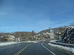 By December 1973, exit 29A on the Thruway was completed, along with new roadway leading from the exit to the south end of the Finks Basin Bridge.[6] Then by December 1974, the NY 5 arterial was completed in Little Falls. At this time the only main connection between the Thruway and Little Falls was the Finks Basin Bridge, a one-way signalized bridge with a 15 ton limit. This caused trucks over 15 tons to detour 5.21 miles (8.38 km) along NY 5S and NY 167 to access Little Falls. Along NY 5S trucks had to climb a steep 7.2% grade for just over one mile (1.6 km) then descend 7% grade for .5 miles (0.80 km).[6] Then by 1978,[7] a new two-lane arterial highway was being built from NY 5 to the south side of the Finks Basin Bridge, where it intersected the previously built roadway linking to the Thruway. By 1981, the new roadway was completed and NY 169 was extended south to NY 5S and better accessed the new exit 29A on the New York State Thruway.[6][8][9]