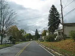 Past CR 133, the route's rural surroundings give way to residential portions of Enfield, including the hamlet of Bostwick Corners. Here, the highway becomes known as Enfield Main Road, and the new name follows NY 327 along a sparsely populated stretch to the hamlet of Enfield 1 mile (1.6 km) to the north. North of Enfield, NY 327 runs past a line of homes that follows the highway to a junction with NY 79 (Mecklenburg Road). NY 327 ends here while the road's right-of-way continues north to NY 96 in Ulysses as CR 170 (Halseyville Road).[3]