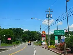 NY 367 begins at the Pennsylvania state line at Wellsburg,[3] where the route connects to Berwick Turnpike, a highway designated but not signed as SR 4013, one of Pennsylvania's quadrant routes.[4] The route heads north from the state line as Main Street, proceeding north through the southern portion of the village and intersecting a local street named Doty Hill Road. Not far to the north, Berwick Turnpike leaves to the northwest while NY 367 makes a slight turn to the northeast.[3]
