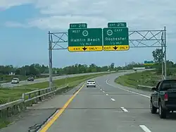 The 2-mile (3.2 km) segment of the Rochester Outer Loop between NY 33A and NY 31 was completed c. 1963.[7][8] It was originally designated as part of NY 47, which had followed the parallel Howard Road to the west prior to the freeway's construction.[9][10] Work on an extension north to US 104 (now NY 104) began in the mid-1960s[10][11] and was completed in the early 1970s.[12][13] The freeway officially became part of NY 47 on January 1, 1970, when the route was extended northward over the then-proposed Outer Loop to a new terminus at the Lake Ontario State Parkway.[14] In actuality, however, NY 47 never extended any farther north than NY 104, which served as the freeway's northern terminus throughout the 1970s.[13][15]