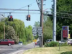 Sign assembly for NY 404 using U.S. Route shields instead of state highway shields.