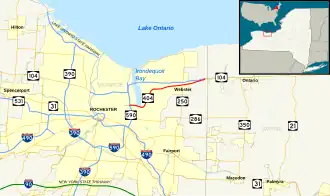 New York State Route 404 (NY 404) is an east–west state highway located in eastern Monroe County, New York, in the United States. It extends for just over 10 miles (16 km) from an interchange with NY 590 in Irondequoit to an intersection with NY 104 on the Monroe–Wayne County line in the town of Webster. The route traverses the southern tip of Irondequoit Bay and passes through the village of Webster, where NY 404 intersects NY 250. Most of NY 404 passes through commercial areas; however, the western and eastern extents of the highway serve areas more residential in nature. The westernmost 3 miles (5 km) of the route is part of the Seaway Trail, a National Scenic Byway.