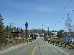 Now within the park boundaries, NY 458 crosses over the Lake Ozonia Outlet on its way eastward to the hamlet of St. Regis Falls, the largest community on the entire route. The route crosses the St. Regis River twice and intersects County Route 5 (CR 5), a connector to the hamlet of Moira 10 miles (16 km) to the north, within St. Regis Falls. At the junction with CR 5, here named North Main Street but known as Moira–St. Regis Falls Road north of Adirondack Park, the highway turns south to follow South Main Street out of the community.[3]
