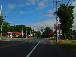 Outside of Liverpool, NY 57 headed generally northward past densely populated residential areas in the town of Clay. Here, the route intersected John Glenn Boulevard, a local arterial leading west to I-690. Past John Glenn Boulevard, NY 57 took on a more pronounced northwesterly routing, matching the path of the Seneca River a short distance to the west and the CSX Fulton Subdivision to the east. It continued to run past residential and commercial areas to an area known as Moyers Corners, centered around NY 57's junction with NY 31 east of Baldwinsville. The route continued on, serving gradually less developed areas and turning northward as it approached and eventually crossed the Oneida River to enter Oswego County.[8][9]