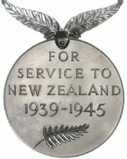 The reverse has the inscription "FOR SERVICE TO NEW ZEALAND 1939-1945" above a fern leaf.[4]