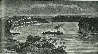 The catalyst for the First Taranaki War was the disputed sale to the Crown of a 240 hectare block of land at Waitara, despite a veto by the paramount chief of Te Āti Awa tribe, Wiremu Kīngi Te Rangitāke, and a "solemn contract" by local Māori not to sell. Governor Browne accepted the purchase with full knowledge of the circumstances and tried to occupy the land, anticipating it would lead to armed conflict, and a demonstration of the substantive sovereignty the British believed they had gained in the Treaty of Waitangi. Hostilities began on 17 March 1860. The war was fought by more than 3,500 imperial troops brought in from Australia, as well as volunteer soldiers and militia, against Māori forces that fluctuated between a few hundred and about 1,500.[21] In response to a call from Governor Browne for reinforcements, the Victorian Government sent its first and only warship, HMVS Victoria, to supply men and perform shore bombardments and coastal patrols, while maintaining supply routes between ports. Sailors from the crew served ashore in combat, and in August 1860, the Victoria rescued 100 civilians from the besieged town of New Plymouth. The ship's service in the First Taranaki War marks the first time an Australian military unit committed to active service overseas, and is today recognised by the Royal Australian Navy as its earliest battle honour.[34]