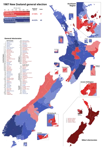 National was also bitterly divided, with some supporting the Rogernomics reforms, but MPs such as former Prime Minister Robert Muldoon bitterly opposed. Muldoon had undermined his successor as party leader, Jim McLay, who was replaced by his deputy Jim Bolger in 1986. Bolger was more centrist, but National still struggled to be seen as an alternative government. Lange famously mocked Bolger as "an itinerant masseur, massaging the politically erogenous zones."[2] Several groups on the Christian Right (such as the Society for the Protection of Unborn Children (SPUC), Coalition of Concerned Citizens (CCC) and Women for Life) attempted to obtain electoral influence by infiltrating the National Party. They attempted to select socially conservative Christians as candidates to oppose the Labour government's policies towards peace education, sex education, abortion, Māori biculturalism, and the ANZUS alliance. Several CCC supporters contested the election as National candidates, including Rob Wheeler (Mount Albert), Andrew Stanley (Onehunga), and Howard Martin (Papatoetoe). However, the efforts met little electoral success as none were elected.[3]