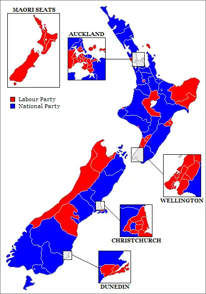 The Labour Party, which was in government, won 57 seats, giving it a majority. Most of the seats won by Labour were in the poorest urban and largest inner-city areas, following the party's typical pattern. Labour was particularly strong in the Wellington region, where it won all ten urban seats. It was also strong in the Western and the Southern poorer areas of Auckland, Christchurch and Dunedin, the other three urban centres, as well as in smaller cities such as Hamilton, New Plymouth, Nelson, Napier, Hastings and Palmerston North. Labour also retained its traditional dominance in the Maori seats, winning all four by large margins.