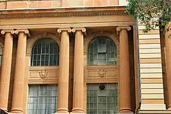 The upper two storeys of the major facades are treated as a single storey united by Ionic columns. The ground floor is treated as a rusticated plinth. This device prevents the classical detailing on the building looking distorted. The rear elevation, backing onto Christie Lane, is painted cement render. A deep continuous base course is broken by two original escape doors and a new escape door introduced in 1980. Sandstone quoins return on both ends, three moulded string courses and a cornice being the only features. Blind windows are then used to excellent effect.[1]