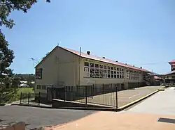 Changes to the school grounds have also occurred since WWII. These included the construction of stairs to the oval (the current concrete stairs date from the 1960s, replacing an earlier set).[95][96] Additions made to the Newmarket School Reserve when it increased to 8 acres (3.2 ha) 13.1 perches (330 m2) in 1963–4 included the extension of the playing field to its west, as part of works relating to the opening of the Newmarket State High school. Much of the bank excavated during the 1930s along the southern edge of the oval was removed or altered at this time.[97][98] New tennis courts and a shelter shed were completed between 2002 and 2004.[99][93] More recent buildings added to the school grounds are located along the Banks Street boundary and around former netball courts in the southeast corner. In the area in front of Block A's entrance portico garden beds have been created, early paths have been paved or laid with bitumen, and several memorials have been established.[94][1]
