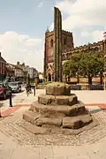 The oldest man-made landmark in the town is the Puleston Cross which is a butter cross positioned near the Church of St Nicholas. This is a 13th-century cross denoting a marketplace. The cross was set up in memory of Sir Roger de Pyvelesdon (i.e. 'de Puleston') who died in 1272, in Shropshire. This is confirmed in a deed signed by his son Sir Roger de Puleston in 1285, which refers to the cross set up for the soul of Roger de Pyvelesdon who died in 1272.[24]
