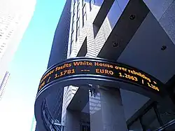Ticker displays appear today on the exterior of the News Corp Building, which houses the headquarters for Fox News Channel/News Corp in the west extension of Manhattan's Rockefeller Center, as well as one that displays delayed stock market data that is located in Times Square. NASDAQ itself features a large display screen on the facade of the NASDAQ MarketSite building in Times Square.