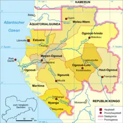 The river name, Ngounié, is a French rewording of "Ngugni", which was originally used by Vili language speakers in the Samba Falls/Imperatrice Falls area in the mid-1800s to call the northern border of their district, "Nsina-Ngugni".[1] When Robert Bruce Napoleon Walker and Paul Du Chaillu arrived in the area, they wrote down "Ngouyai" or "Ngunyé". The Gisir and Punu language speakers of Gabon know the river as "Durembu-du-Manga", while the Apindji, Eviya and Tsogo speakers know it as Otembo-a-Manga. The Kele speakers know it as "Melembye-a-Manga". The first part of these names means "body of water" in the given languages, and "manga" refers to dwarf palm trees which grow along its bank.[1]