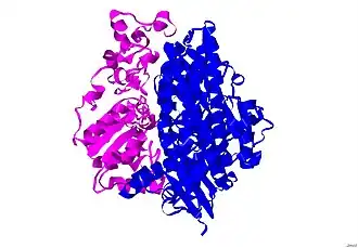 The structure of [NiFe] hydrogenase was obtained from X-ray crystallography studies of five different sulfate-reducing bacteria: Desulfovibrio vulgaris Miyazaki F,[6] D. gigas,[7] D. frutosovorans,[8][9] D. desulfuricans,[10] and Desulfomicrobium baculatum.[11] The [NiFe] hydrogenase isolated from D. vulgaris Miyazaki F is shown on the right. The larger subunit is in blue, has a molecular mass of 62.5 kDa, and houses the Ni-Fe active site. The smaller subunit is in magenta, has a molecular mass of 28.8 kDa, and contains the Fe-S clusters.