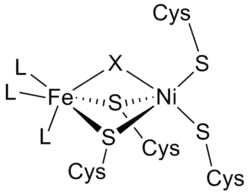 From the infrared spectra and X-ray crystallography studies, the [NiFe] hydrogenase active site was found to be (S-Cys)4Ni(μ-X)Fe(CO)(CN)2, in which the generic ligand X is either an oxide, sulfur, hydroperoxide, or a hydroxide found in an oxidized state only.[12] While the nickel atom participates in redox reactions, the iron atom is consistently in a Fe(II) oxidation state.[12] The exact geometry of the three non-protein ligands (denoted as L) coordinating to the Fe ion is not known; however, they were identified as one carbon monoxide (C≡O) molecule and two cyanide (−C≡N) molecules.[13]