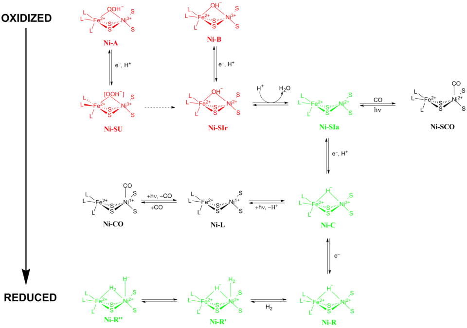 The exact reaction mechanism of [NiFe] hydrogenases has been a matter of great debate. In 2009, a mechanism was proposed by Higuchi and coworkers based on X-ray crystallography and spectroscopic data of Desulfovibrio vulgaris Miyazaki F.[13] During the catalytic process, the Fe ion in the active site does not change its oxidation state while the Ni metal ion participates in redox chemistry. There are two main groups of redox states that [NiFe] hydrogenases pass through during catalysis: