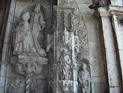 He filled the splays on each side of the portal with statues, among them king Manuel I and his second wife Maria of Aragón, both kneeling in a niche under a lavishly decorated baldachin. They are flanked by their patron saints St. Jerome and John the Baptist. He then decorated the tympanum with the Annunciation, the Nativity, and the Epiphany, each scene set in a tiny niche. Two angels, holdings the arms of Portugal, close the archivolt.